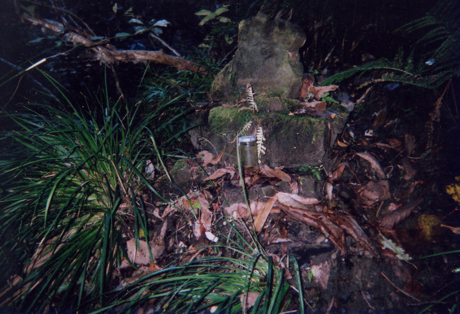 | @ 大山津見神の祠 大福山梅ヶ瀬渓谷を結ぶ径にあった。今はその脇の尾根筋に 移され、石碑だけになった。 |