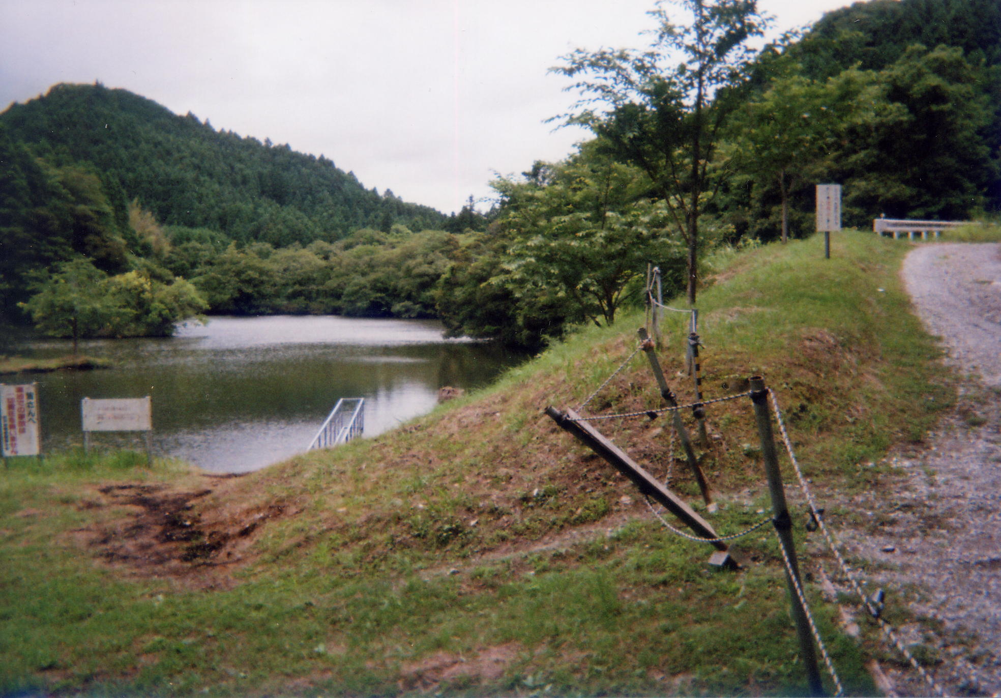 黒い石碑が建ち、未舗装道の門扉を開閉して池の右岸を進む。