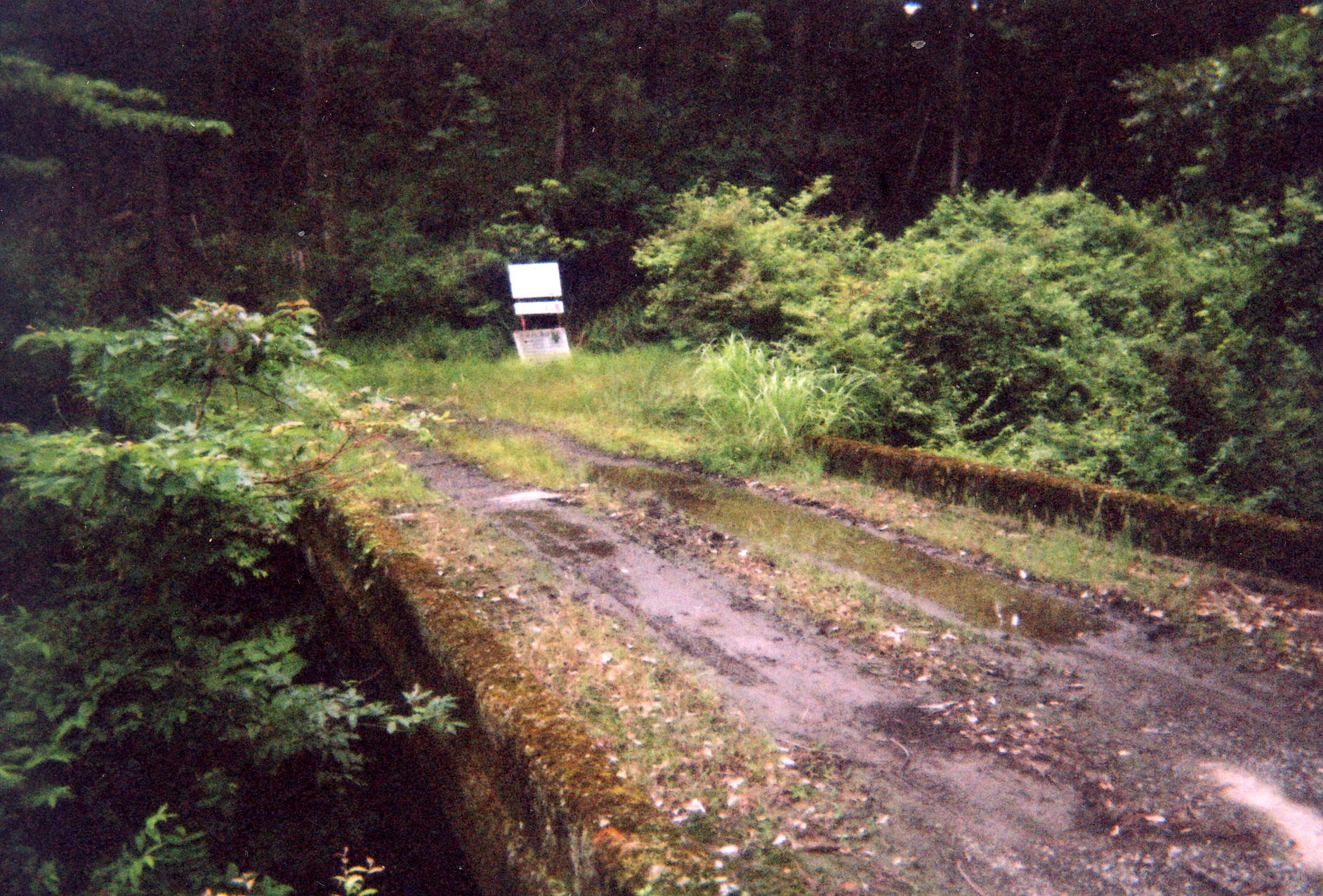 る。南へ向き直ると、分岐に出て左へ進む。色の塗られたガードレールで未舗装道の終点になる。