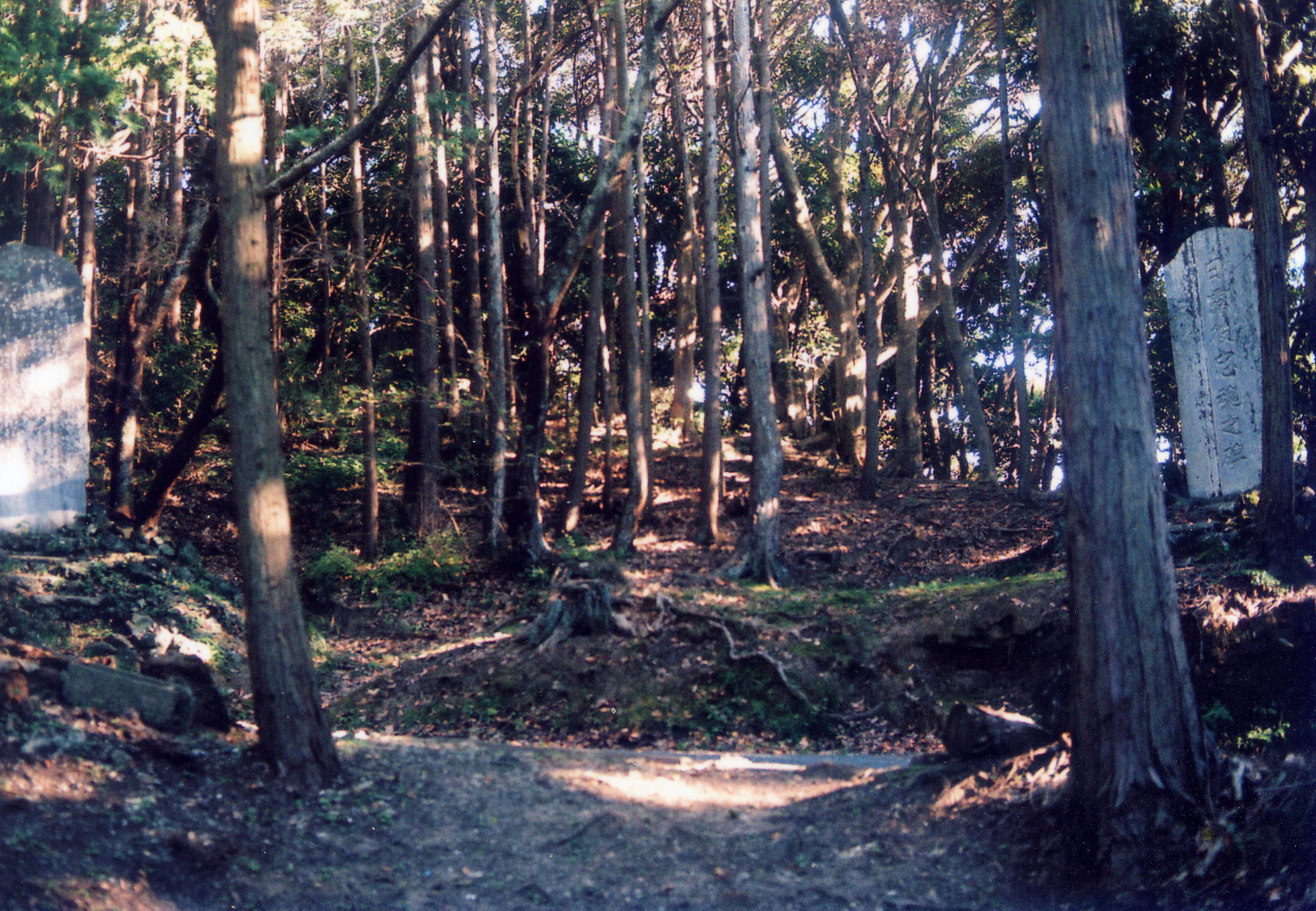 わって幅広い尾根筋はシイの落ち葉に埋まり、太い木の並木になる。小さな祠の後ろ側から頂上に達する。