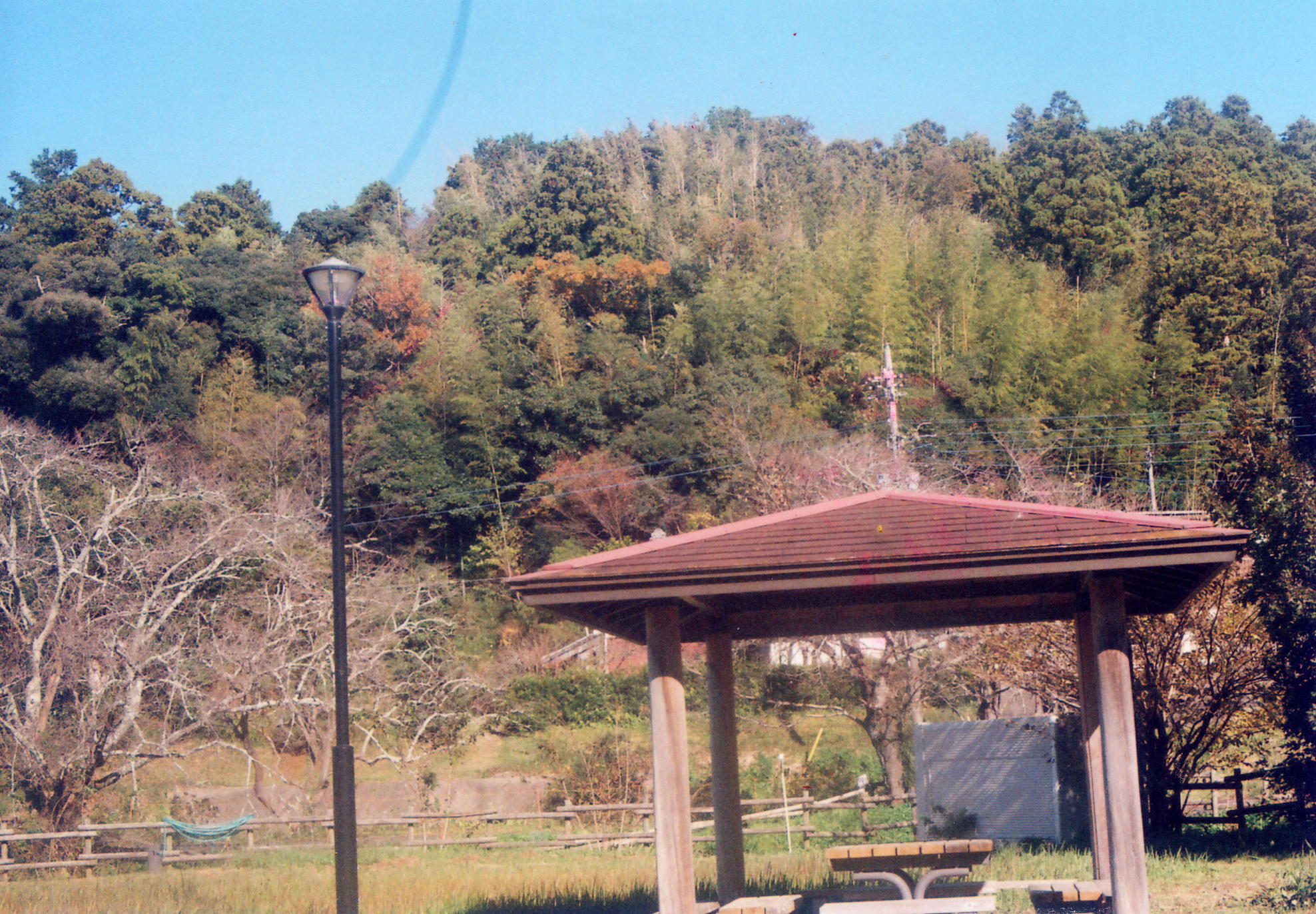 | L−4 成願寺堰内の東屋と遠方に城山 周東城跡 |