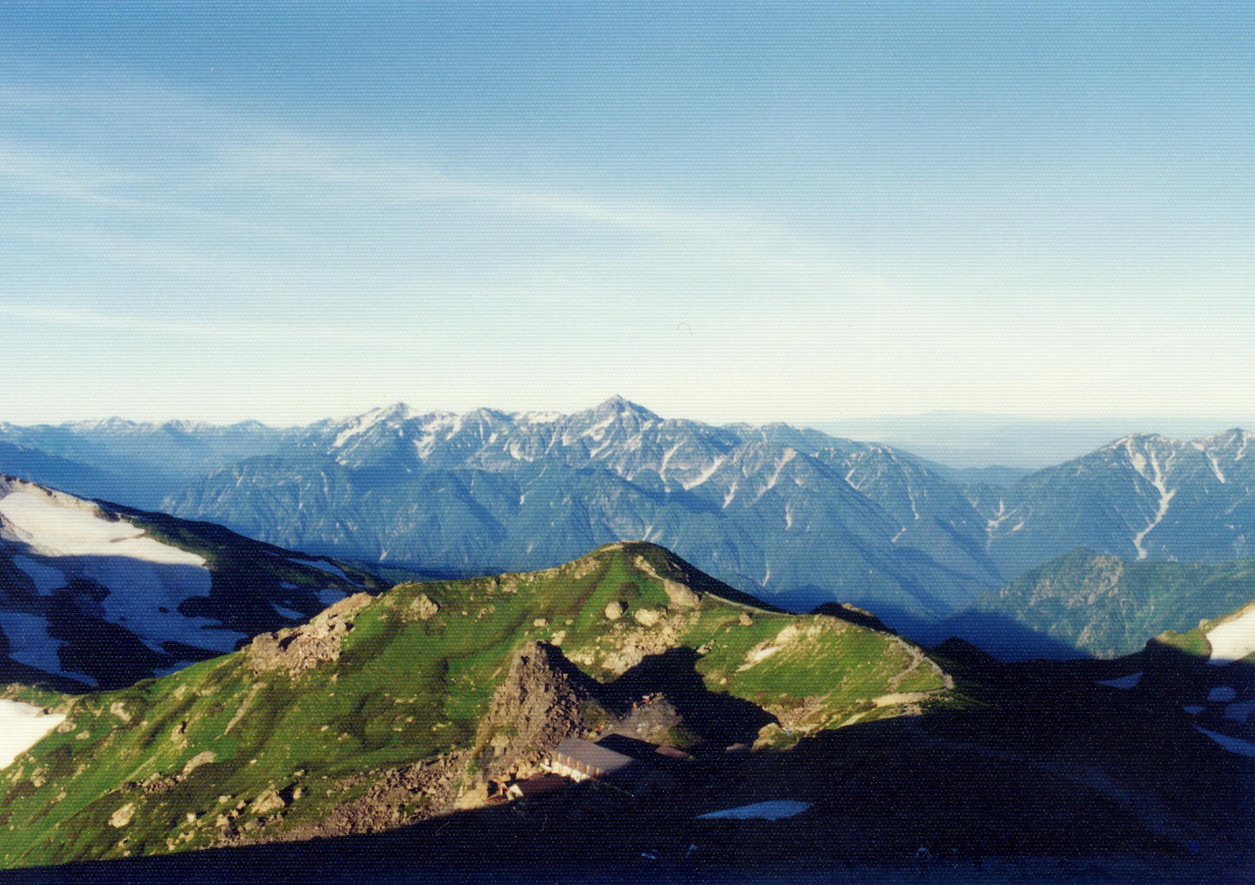 | 中央中ほどに丸山 山頂の山荘 遠方は剣岳と立山連峰 |