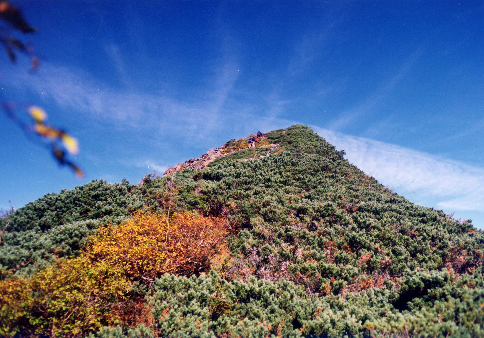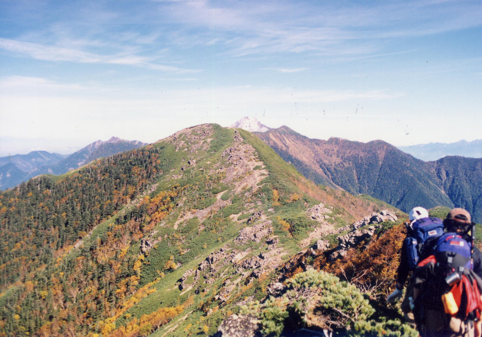 | 中央やや左寄りの緑の盛り上がりが山頂 奥の白い三角は甲斐駒です。 山頂手前の岩壁脇附近を通過 |